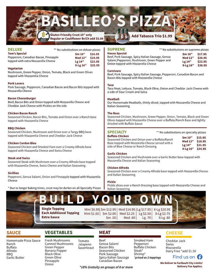 Scroll through our Faribault Basilleo's Pizza Menu Below. We have pizza, pasta, salads, sandwiches and more at Basilleo's Pizza 2.0 in Faribault. We have homemade pizza sauce and dough that is a tradition for families and making memories. Try our locally owned Faribault pizza restaurant today.